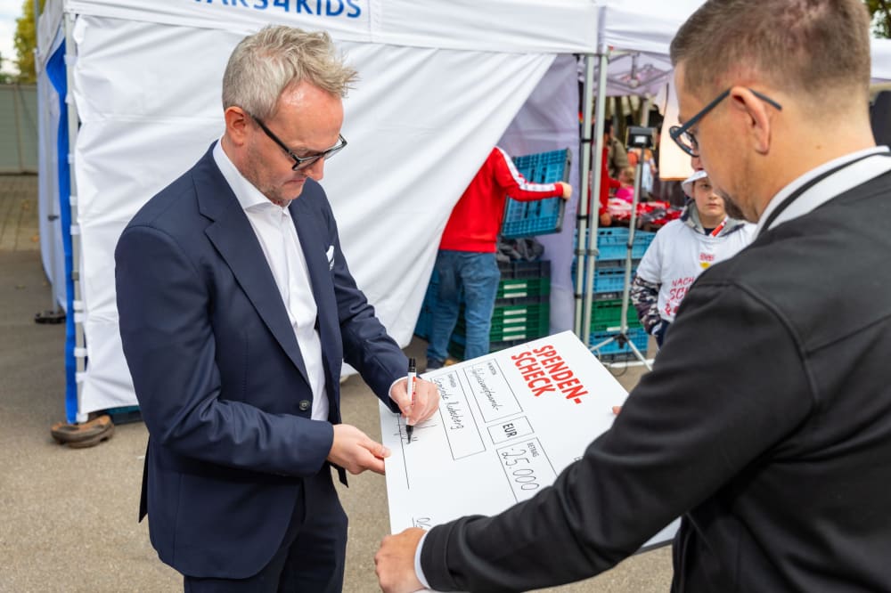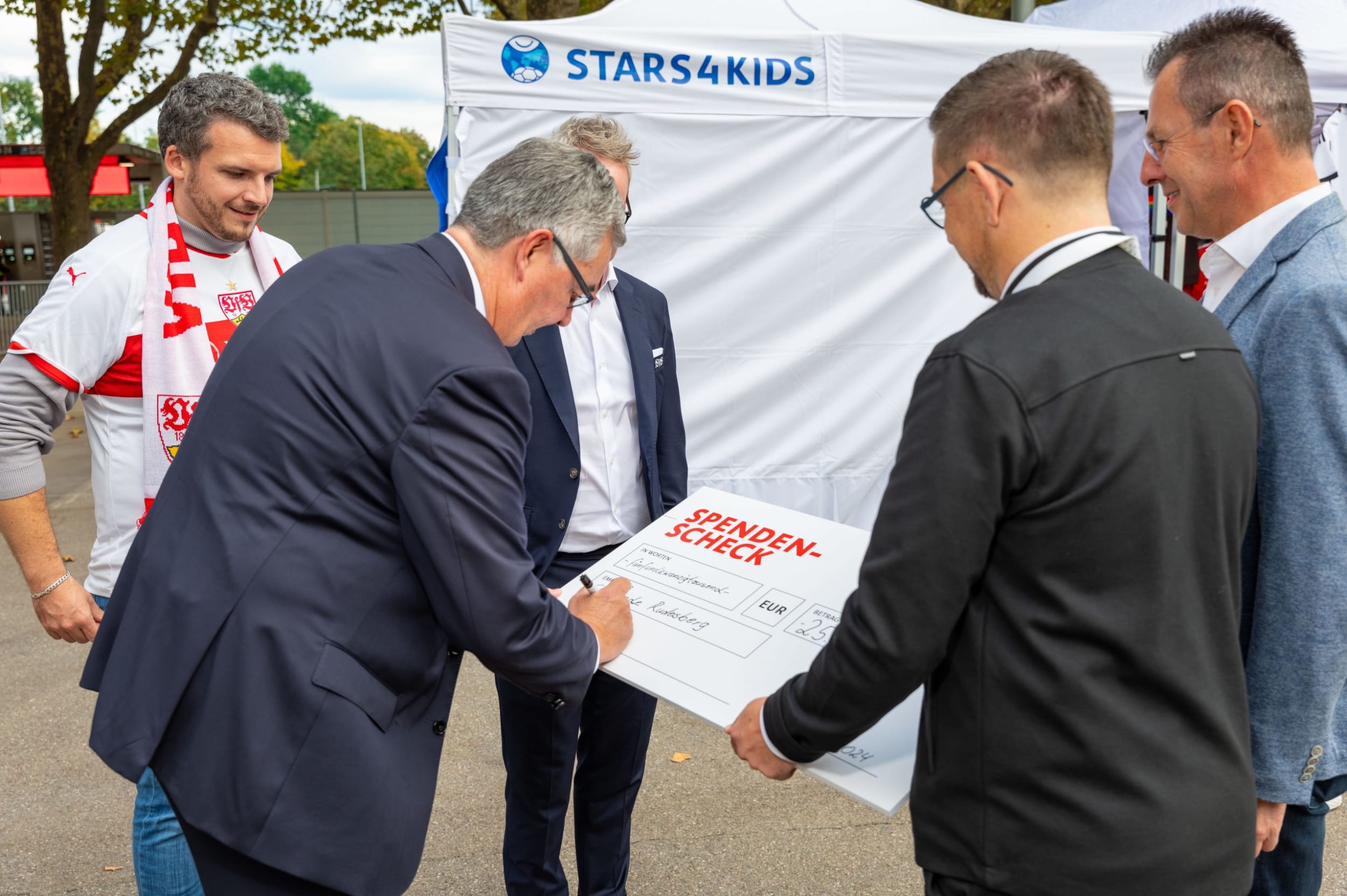 Die beachtliche Spendensumme von 25.000 Euro ist das Ergebnis der Tombolaaktion, die im Rahmen der Saisoneröffnung gegen Athletic Bilbao durchgeführt wurde und bei der die VfB-Fans herausragend durch den Kauf von Losen unterstützt haben. Zur offiziellen Scheckübergabe waren hochrangige Vertreter aus Sport und Politik anwesend: Dietmar Allgaier, Präsident des VfB Stuttgart, der Vorstandsvorsitzende Alexander Wehrle, Stars4Kids-Vorstand Martin Schäfer sowie der Bürgermeister der Gemeinde Rudersberg, Raimon Ahrens.