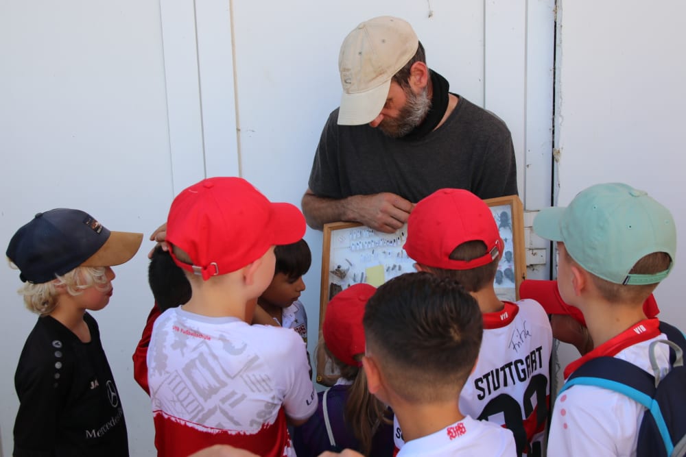 Am Nachmittag übergab Schäfer eine Spende von 90.000 Euro an die VfB-Stiftung, vertreten durch die beiden Zeugwarte Michael Meusch und Thomas Schultheiß.