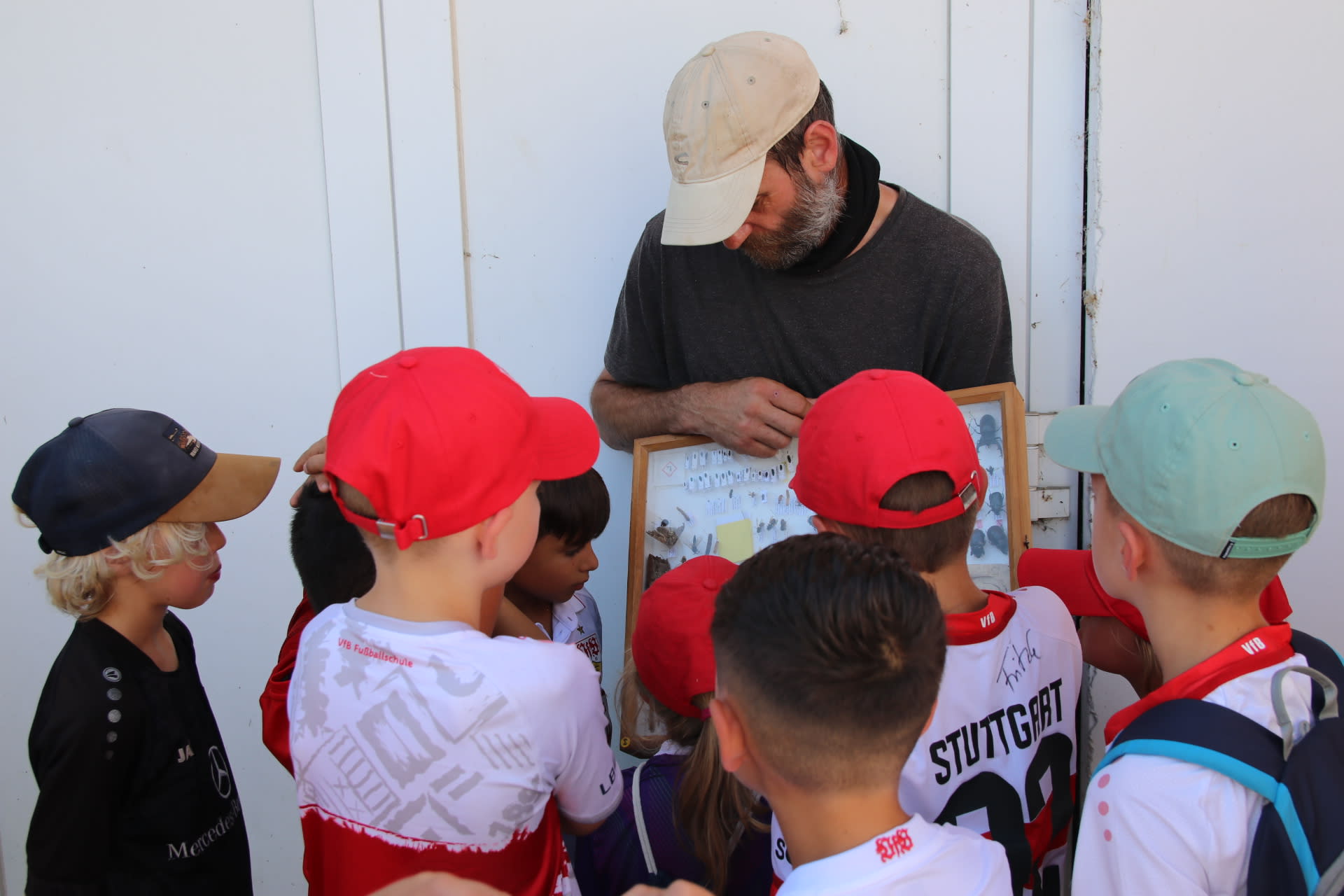Abseits des Trubels auf der Mercedesstraße fand eine Premiere auf dem Clubgelände statt: die VfB-Stiftung bot zwei Führungen auf dem Biodiversitäts-Lehrpfad an. Kinder aus dem Fritzle-Club, die im Vorfeld Tickets über eine Verlosung gewonnen hatten, erfuhren in einem 45-minütigem Rundgang, warum der VfB in Kooperation mit dem NABU im vergangenen Jahr eine rund 400 Quadratmeter große Fläche für Insekten und Tiere aufgewertet hat. „Rasenplätze haben für Insekten keinen Nutzen. Als Pendant dazu haben wir einen vielfältigen Lebensraum für heimische Insekten und Tiere geschaffen“, erklärte Entomologe Markus, „Die Stauden und Blüten dienen als Tankstelle“.