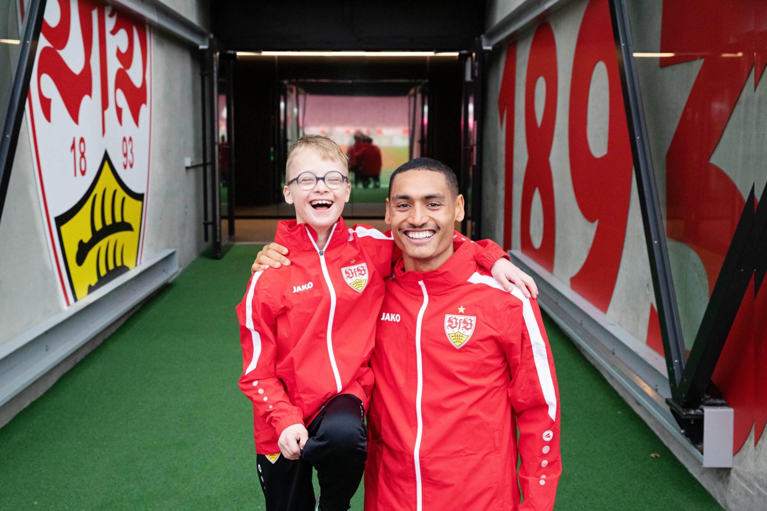Neu in diesem Jahr: Statt ins VfB-eigene Fotostudio ging es in die nahe gelegene MHP Arena – die Wahrheit liegt schließlich auf dem Platz. Und so machten Sami und Joshi erst einmal große Augen, als es direkt ins Stadion und dort dann in den exklusiven Porsche Tunnel Club ging. Und die Augen und auch das Grinsen wurden noch größer, als die Profis dazustießen und die beiden, die Profis an der Hand, durch den Spielertunnel schreiten durften. Da war es dann auch egal, dass es der Wettergott nicht ganz so gut mit den Beteiligten meinte und es rund um den Platz eher regnerisch und windig zuging.